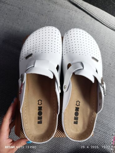 Leon bele anatomske papuče, model 700M, broj 46. Izrađene od kože sa perforiranim gornjim delom za bolju ventilaciju. Imaju podesivu kopču sa strane za prilagođavanje širine. Anatomski oblikovan uložak pruža udobnost i potporu stopalu. Praktične su za nošenje kod kuće ili na poslu.