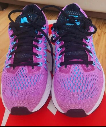 Nike Zoom Pegasus 32 - zenske patike u ljubičastoj boji sa plavim detaljima,br 39, gaziste 25 cm, dizajnirane su za optimalnu udobnost i performanse. Gornjište je izrađeno od prozračnog mrežastog materijala koji omogućava dobru ventilaciju stopala. Crne pertle pružaju sigurno prianjanje, dok prepoznatljivi Nike "swosh" simbol u plavoj boji dodaje stilski pečat. Patike su pogodne zai sportske aktivnosti, nudeći podršku i amortizaciju. Model Zoom Pegasus 32 idealan je za sve koji traže pouzdanu i udobnu obuću.