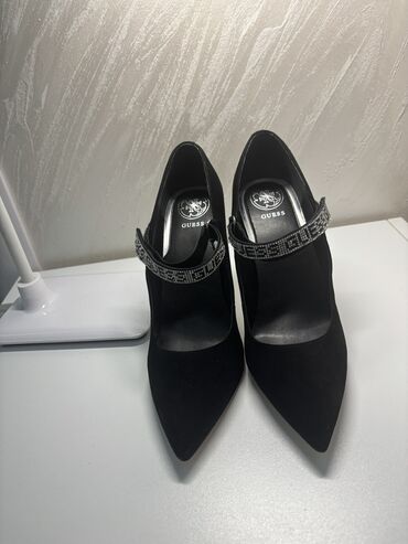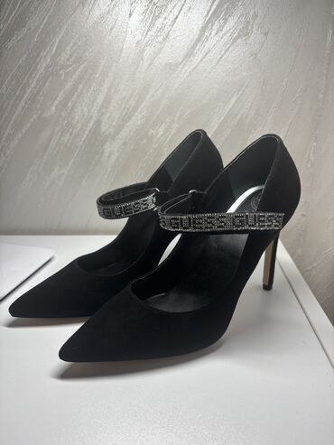 GUESS elegantne ženske salonke - Model: klasične salonke sa špicastim vrhom - Boja: crna - Materijal gornjišta: baršunasto/brušeno (suede-look) - Potpetica: visoka, tanka štikla - Kaiš preko rista...