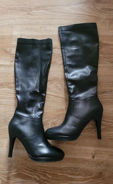 Ženske visoke čizme do kolena, crne. U savršenom stanju, nošene samo po sobi, prodajem zato što su mi male. - Materijal: gornji deo kombinacija glatke eko-kože i elastične tekstilne strane koja ...