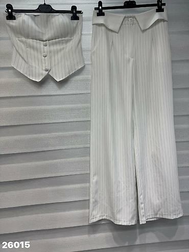 - Pantalone: ravne, široke nogavice, dužina do poda; džepovi sa strane; visoki struk sa efektom prevrnutog pojasa i jednim dugmetom