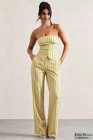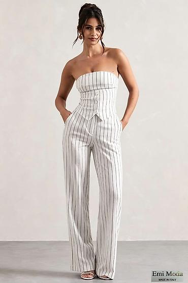 - Dizajn: korzet-top bez bretela + široke pantalone visokog struka