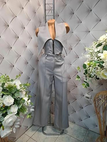 - Moderan dvodelni komplet sastavljen od kratkog prsluka i visokog struka pantalona.
