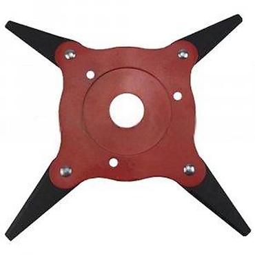 Ovaj disk za trimer ili kosilicu sa četiri oštrice je dizajniran za efikasno sečenje trave i korova. Centralni disk je crvene boje, a četiri crne oštrice su pričvršćene metalnim zakovicama, što omogućava stabilnost tokom rada. U sredini se nalazi okrugli otvor za montažu na trimer, kao i dodatne manje rupe koje mogu služiti za balansiranje ili specifično pričvršćivanje. Pogodan je za različite modele trimera i pruža čisto i precizno košenje.