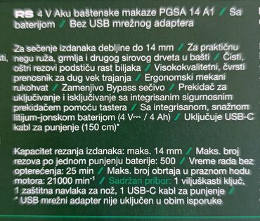 Kompaktne, lagane i jednostavne za upotrebu – za brzo i efikasno orezivanje biljaka u dvorištu ili voćnjaku. Model: PGSA 14 A1. Brend: Parkside.