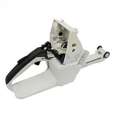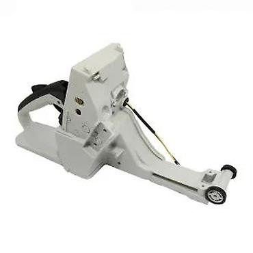 Ovo je kućište za motornu testeru, dizajnirano da smesti ključne komponente testere. Kućište je bele boje i sadrži integrisani rezervoar za gorivo, ručku i deo za montažu. Vidljivi su i električni kablovi, što ukazuje na prisustvo električnih komponenti unutar ili na kućištu. Na prednjem delu se nalaze točkovi, što može olakšati manevrisanje ili pružiti podršku tokom rada. Idealan je za zamenu oštećenog kućišta ili kao deo za sklapanje nove motorne testere.
