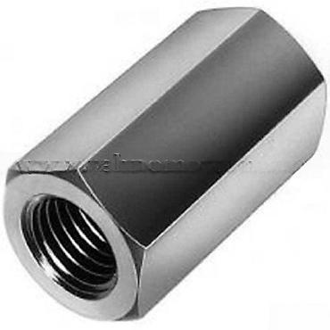 Šestougaona spojna navrtka, poznata i kao produžna navrtka, dizajnirana je za spajanje dve muške navojne šipke ili vijka. Njen izduženi oblik sa unutrašnjim navojem omogućava sigurno i čvrsto spajanje, produžavajući dužinu navojnih komponenti. Idealna je za primene gde je potrebno produžiti navojne veze ili spajati komponente koje su razdvojene. Izrađena je sa šestougaonim spoljnim profilom za lako zatezanje i otpuštanje standardnim ključem.