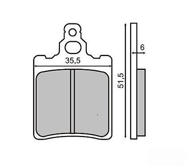 Dve kočione pločice pravougaonog oblika, dimenzija približno 35,5 x 51,5 mm sa debljinom od 6 mm. Jedna pločica ima frikcioni materijal tamno sive boje, dok druga prikazuje metalnu podlogu sa četiri kružna udubljenja. Na vrhu svake pločice nalazi se izbočeni deo sa rupom, namenjen za montažu. Ove pločice su pogodne za upotrebu u kočionim sistemima motocikala, skutera ili ATV vozila, obezbeđujući efikasno zaustavljanje i pouzdanost.