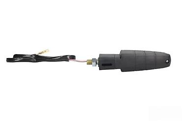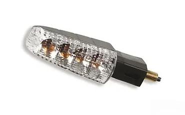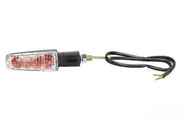 Indikator pravca za motocikl sa prozirnim sočivom i narandžastim sijalicama. Kućište je u crnoj boji, opremljeno navojem za montažu i električnim žicama za povezivanje. Idealan je za signalizaciju promene pravca vožnje, doprinoseći bezbednosti na putu.