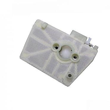 Filter za vazduh, pravougaonog oblika sa zaobljenim ivicama, dizajniran za efikasno prečišćavanje vazduha. Poseduje mrežastu strukturu sa obe strane, idealnu za zadržavanje čestica prašine i prljavštine. Na jednoj strani se nalaze dva kružna otvora za montažu, dok je na drugoj strani vidljiv manji, pravougaoni plastični deo sa oprugom, koji verovatno služi za fiksiranje ili kao deo mehanizma. Izrađen od plastike i filterskog materijala bele boje, pogodan je za upotrebu u različitim mašinama gde je potrebno čisto usisavanje vazduha.