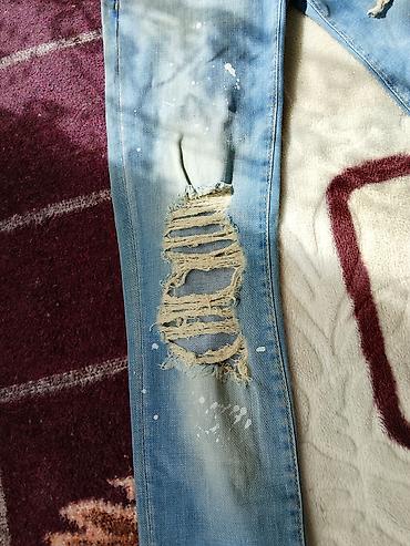 - Dizajn: više distressed otvora i iscepanih delova na butinama i kolenima, neravni rubovi, dekorativne “paint splatter” tačkice po nogavicama.