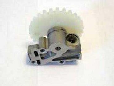 - Mehanički sklop pogona pumpe za ulje, sa aluminijumskim/metalnim kućištem i belim plastičnim zupčanikom.
