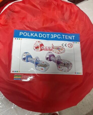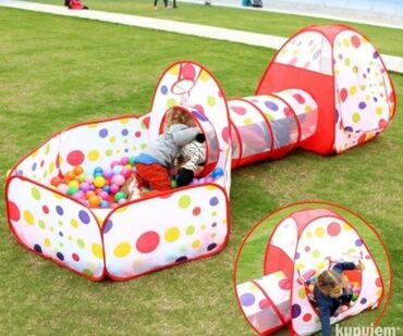 - Sastav: 3 poveziva elementa – tipi šator, tunel i ograđeni bazen za loptice, sa šarenim tačkicama.