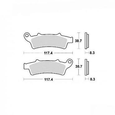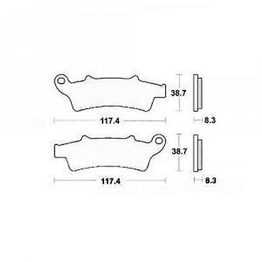 - Dimenzije pločica: dužina 117,4 mm, visina 38,7 mm, debljina frikcionog materijala 8,3 mm