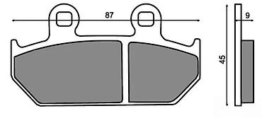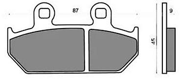 U kompletu se dobijaju dve pločice (za jednu prednju čeljust). Pre ugradnje uporediti sa starim pločicama ili prema datoj skici: 87 x 45 x 9 mm.