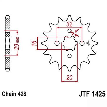 Pogodno za motocikle i skutere koji koriste standard lanca 428 i odgovarajući profil osovine. Obezbeđuje pouzdan prenos snage i precizno naleganje zahvaljujući mašinski obrađenim zubima i navojnim otvorima. Model označen: JTF1425 13.
