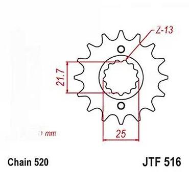 Šifra/model: JTF 516. Idealno kao deo seta sa zadnjim lančanikom i lancem 520 iste specifikacije. Pre ugradnje proveriti broj zuba i kompatibilnost sa modelom motocikla koji koristi JTF516 profil.