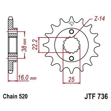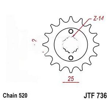 Napomena: Proveriti broj zuba i mere sa crteža JTF736 kako bi odgovaralo vašem modelu motocikla i prenosu. Idealno za sisteme sa lancem 520 gde je potreban lančanik sa splajnovanim otvorom 25 mm i tačkama za učvršćivanje.