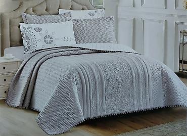 Prekrivač za bračni krevet – set sa dekorativnim jastučnicama - Elegantno prošiven prekrivač sa reljefnim ornamentalnim motivima i diskretnim talasastim štepom - Rub ukrašen sitnim pomponima/obrub...