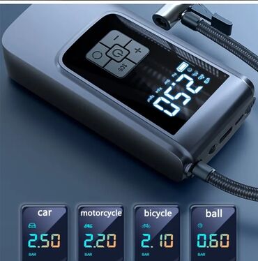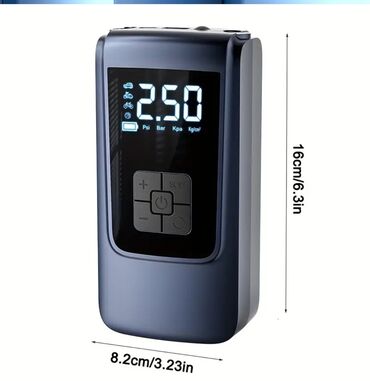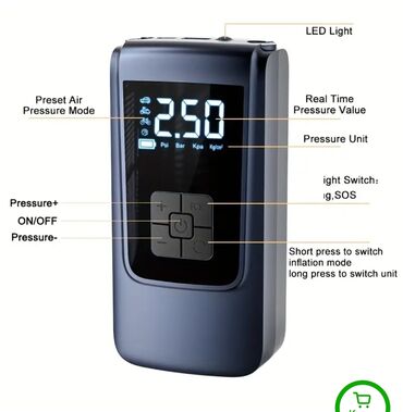 - Veliki LED ekran: prikaz trenutnog pritiska u realnom vremenu i izabranih jedinica (PSI, Bar, KPa, Kg/cm²). Vidljive ikonice za režime automobila, motocikla, bicikla i lopti.
