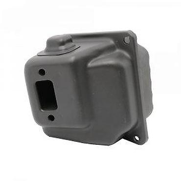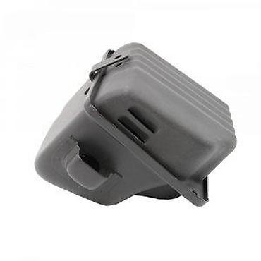 Prigušivač za mali motor, dizajniran za smanjenje buke izduvnih gasova. Izrađen je od metala tamno sive boje, sa pravougaonim oblikom i zaobljenim ivicama. Poseduje prirubnicu sa rupama za montažu, što omogućava stabilno pričvršćivanje na motor. Otvor za izduvne gasove je pravougaonog oblika. Idealan je za zamenu starog ili oštećenog prigušivača na motornim testerama, trimerima ili sličnim baštenskim mašinama.