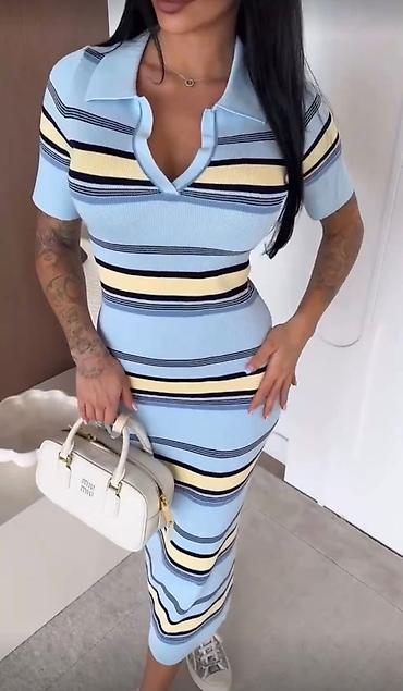 - Model: pripijena midi haljina do listova, kratki rukav, polo kragna sa V-izrezom