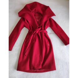 P.S. Fashion crveni kaput S velicina. Odlicno stanje, minimalni tragovi koriscenja. Boja je tamnija nego na slici, vuče ka bordo. Model duzine do kolena, sa postavom i velikom kragnom/kapuljačom.