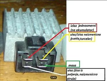 - Funkcija: regulacija i ispravljanje napona iz alternatora (AC u DC) za napajanje instalacije i punjenje akumulatora