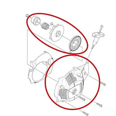 Pogodno kao zamenski deo za testere sa sličnim rasporedom šrafova i poklopca ventilatora. Priložena skica ilustruje raspored delova starter sklopa radi lakšeg prepoznavanja i ugradnje. Pre kupovine uporediti oblik, mere i položaj montažnih otvora sa postojećim starterom.