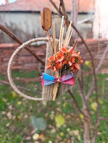 Ručno rađen dekorativni visilica/mini venac od prirodnih materijala. Osnova je kružni ram obmotan konopcem, kombinovan sa pravougaonim segmentom od jute/konca. Ukras čine sitni snopići slame/trske, tri tekstilna cveta u narandžastoj boji i mašnica od platna u plavo‑crveno‑ružičastim tonovima. Drvena perla služi kao nosač za kačenje.