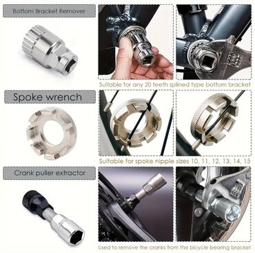 Idealan set za kućni servis: zamena/čišćenje lanca, skidanje kurbli i donjeg ležaja, pravljenje točka i zatezanje žbica, kao i rad na kaseti/slobodnom točku. Kompaktan, pregledno organizovan i spreman za radionicu ili terensku upotrebu.
