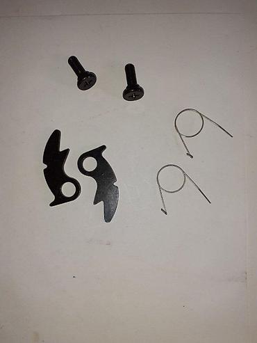 Set hardverskih komponenti koji uključuje dva crna šrafa sa ravnom glavom, dve metalne opruge spiralnog oblika i dva crna metalna dela specifičnog oblika. Ovi delovi su pogodni za zamenu ili montažu u različitim mehaničkim sistemima. Šrafovi su dizajnirani za sigurno pričvršćivanje, dok opruge obezbeđuju potreban pritisak ili povratni mehanizam. Crni metalni delovi sa rupama mogu se koristiti kao poluge ili delovi složenijih mehanizama. Idealno za popravke, hobiste ili profesionalce koji rade sa sitnom mehanikom.
