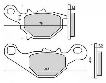 Set kočionih pločica dizajniran za efikasno zaustavljanje. Pločice su izrađene od kompozitnog materijala, obezbeđujući pouzdane performanse. Gornja pločica ima dimenzije 76 mm dužine i 41,5 mm širine, sa debljinom od 8,2 mm. Donja pločica je dugačka 99,5 mm, široka 40,5 mm i debela 7,5 mm. Pogodne su za različite tipove motocikala ili skutera, nudeći stabilnost i sigurnost prilikom kočenja.
