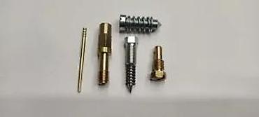 - U kompletu su: dve mesingane dizne/nastavci sa spoljnim navojem, tanki mesingani klin/igla, čelični šraf sa grubim navojem (samourezujući tip), čelični stožasti anker/klin sa šrafovskim navojem i mali mesingani vijak/adapter sa šesterostranom glavom.