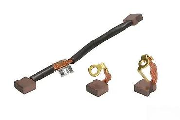 Set ugljenih četkica, esencijalnih komponenti za različite električne uređaje i motore. U setu se nalaze tri četkice: jedna sa izduženim kablom i dve kraće, samostalne četkice sa metalnim priključcima. Izrađene su od materijala pogodnog za električnu provodljivost i otpornost na habanje, što obezbeđuje pouzdan prenos struje unutar uređaja. Ove četkice su pogodne za popravku ili zamenu istrošenih delova u električnim alatima, kućnim aparatima ili drugim motorima koji koriste sličan mehanizam.