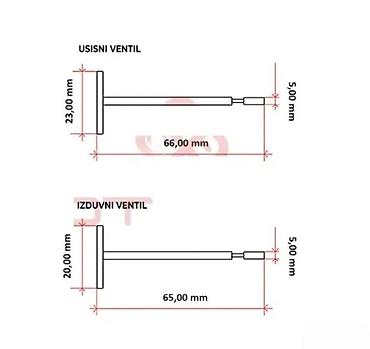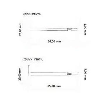 - Usisni ventil: prečnik glave 23,00 mm; ukupna dužina 66,00 mm; prečnik drška 5,00 mm.