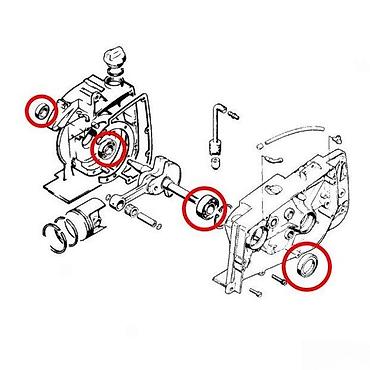 - Ilustracija prikazuje pozicije ugradnje na kućištu i radilici (spoljašnji semering, unutrašnji semering i ležaj radilice).