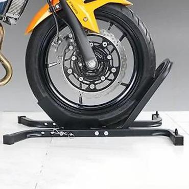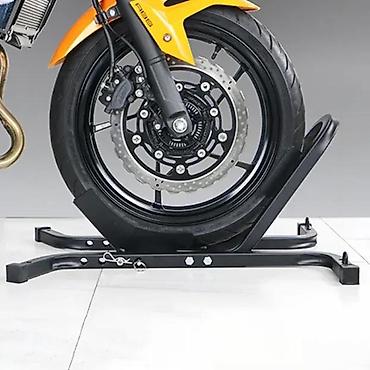 Pogodno za većinu cestovnih motocikala sa prednjim točkom standardnih dimenzija. Idealan dodatak za radionice, garaže i prevoz na prikolici ili u kombiju. Čvrst, podesiv i jednostavan za upotrebu – samo se uveze točkom u stalak i točak je učvršćen klinom.