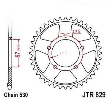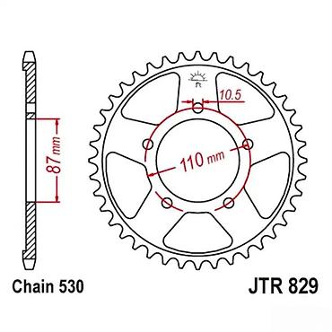 Pogodno za motocikle koji koriste standard JTR 829 i lanac 530. Pre kupovine proveriti dimenzije: prečnik glavčine (110 mm), prečnik i raspored montažnih rupa (10,5 mm), kao i broj zubaca u odnosu na željeni prenos. Izdržljiv čelični zupčanik obezbeđuje precizan prenos snage i dug vek trajanja. Idealno za ugradnju kao deo seta sekundarnog prenosa.