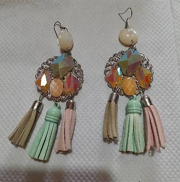- U kompletu: viseće minđuše sa okruglom filigranskom osnovom, iridescentnim kamenčićima u toplim nijansama i tri resice (mentol, puder roze, bež) – usklađene sa bojom haljine.
