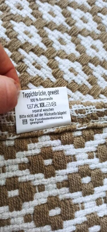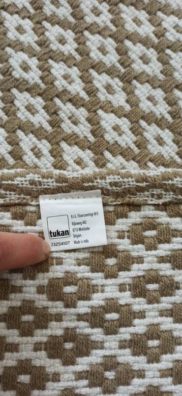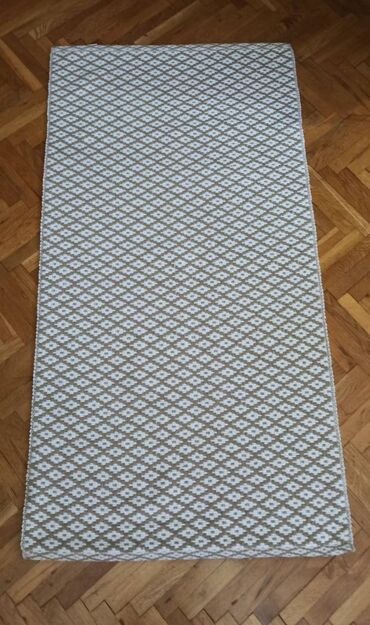 - Dizajn: sitan romboidni/geometrijski uzorak u bež i beloj boji; obostrano tkanje koje daje prijatan, prirodan izgled
