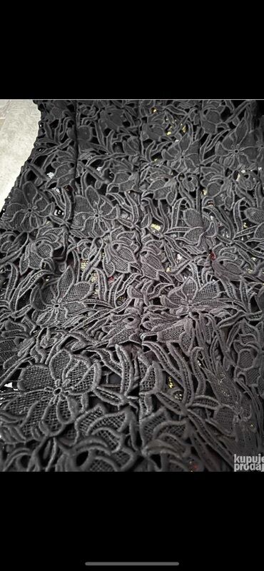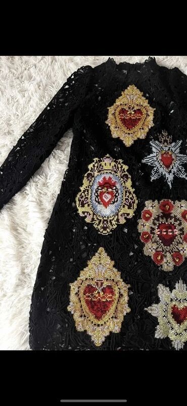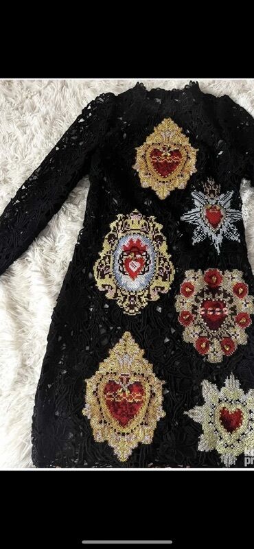 Drugi materijalCrna čipkana haljina sa dugim rukavima, ravnog kroja do iznad kolena. Prednji deo ukrašen velikim aplikacijama u boji – raskošni motivi srca u zlatnim, crvenim i srebrnim tonovima, raspoređeni duž cele dužine. Bogata, trodimenzionalna čipka sa floralnim izrezima daje efekat teksture i prozračnosti; detalji sjajnih perlica i konaca diskretno svetlucaju na svetlu. Zatvoreni okovratnik, leđa bez aplikacija radi čistog izgleda. Idealna za večernje prilike i specijalne događaje, upečatljiv komad koji naglašava siluetu i privlači pažnju.