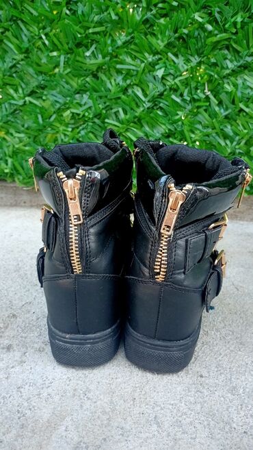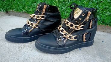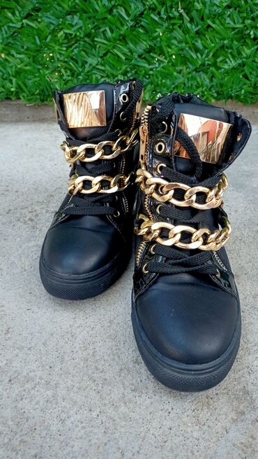 Crne visoke patike sa izraženim zlatnim detaljima.