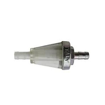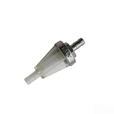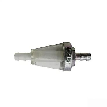 Univerzalni in-line konusni filter goriva, dizajniran za efikasno prečišćavanje goriva pre ulaska u motor. Izrađen je od providne plastike sa metalnim završecima, što omogućava laku vizuelnu proveru stanja filtera. Poseduje rebraste priključke za sigurno povezivanje creva, idealan za zaštitu karburatora i sistema za dovod goriva u malim motorima od nečistoća. Pogodan za razne primene gde je potrebna pouzdana filtracija goriva.