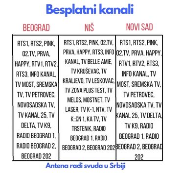 - Radi širom Srbije – primeri dostupnih kanala prikazani za Beograd, Niš i Novi Sad (RTS1/2/3, Pink, O2.TV, Prva, Happy, RTV1/2, Info kanal, TV Most, Sremska TV, TV Petrovec, Novosadska TV, TV Kanal 25, TV Delta, TV K9, lokalni kanali i Radio Beograd 1/2/202).