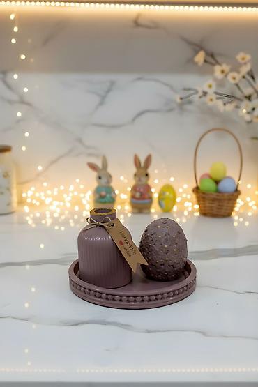 - kompaktni duet na ovalnoj tacni (npr. jaje i minijaturna “kupola” sa etiketom Handmade).