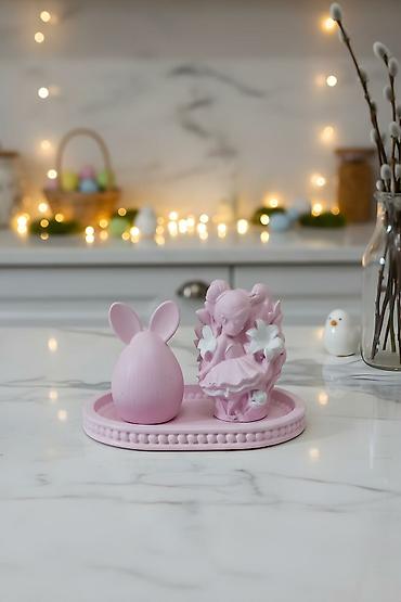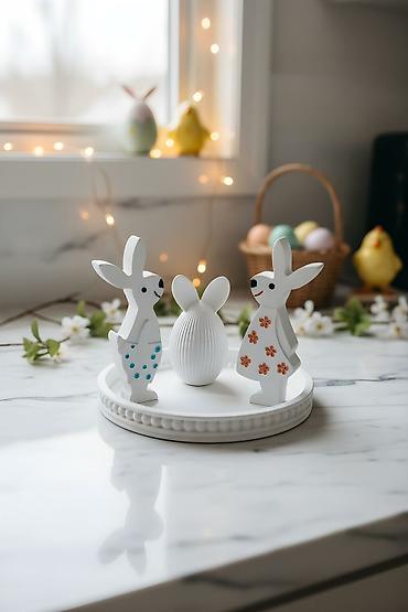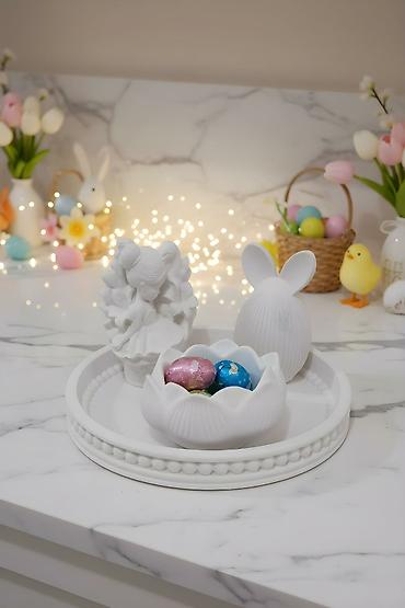 - Tematske dekoracije za sto/policu: uskršnje jaje sa ušima zeke, figurinice (zec, balerina/devojčica sa cvećem), dekorativne činijice u obliku cveta i ovalne/okrugle tacne sa reljefnim rubom.