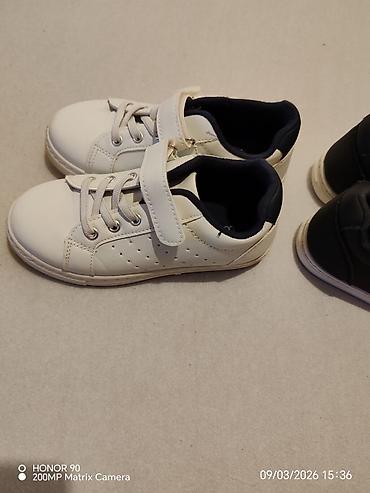 - Bele patike sa crnim detaljima; pertle + čičak kaiš na ristu.