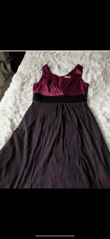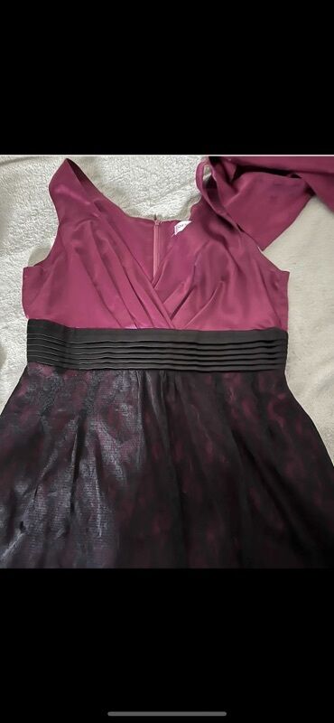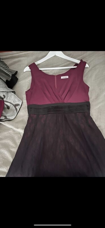 PoliesterVelicina 40.Elegantna ženska haljina bez rukava, midi dužine. Gornji deo od satenskog materijala u boji burgundca sa preklopljenim V dekolteom. U struku je široka crna traka sa finim horizontalnim naborima koja vizuelno sužava liniju. Donji deo je crna šifonska/svilena suknja sa diskretnim bordo floralnim dezenom i laganim padom. Leđa sa skrivenim rajsferšlusom. Brend: Orsay (etiketa vidljiva na fotografijama). Idealan model za svečane prilike, venčanja, proslave ili večernje izlaske. Kombinujte sa crnim štiklama i jednostavnim nakitom za potpun, sofisticiran izgled.
