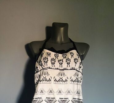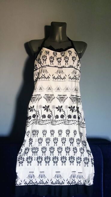 Prelepa bela sa crnim cvetovima. Ne rasteže se. Ima skriveni rajsferšlus sa strane. Veže se oko vrata. Dužina 86 (oko kolena, midi)